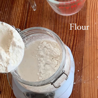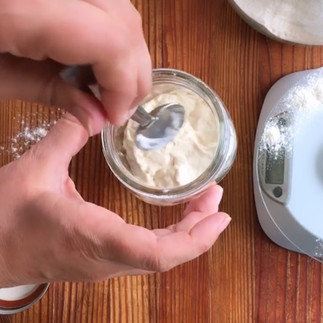 Measure out and add to your jar 25g flour and 25g water, (or 1Tbsp flour and 1Tbsp water). Mix the ingredients until combined.